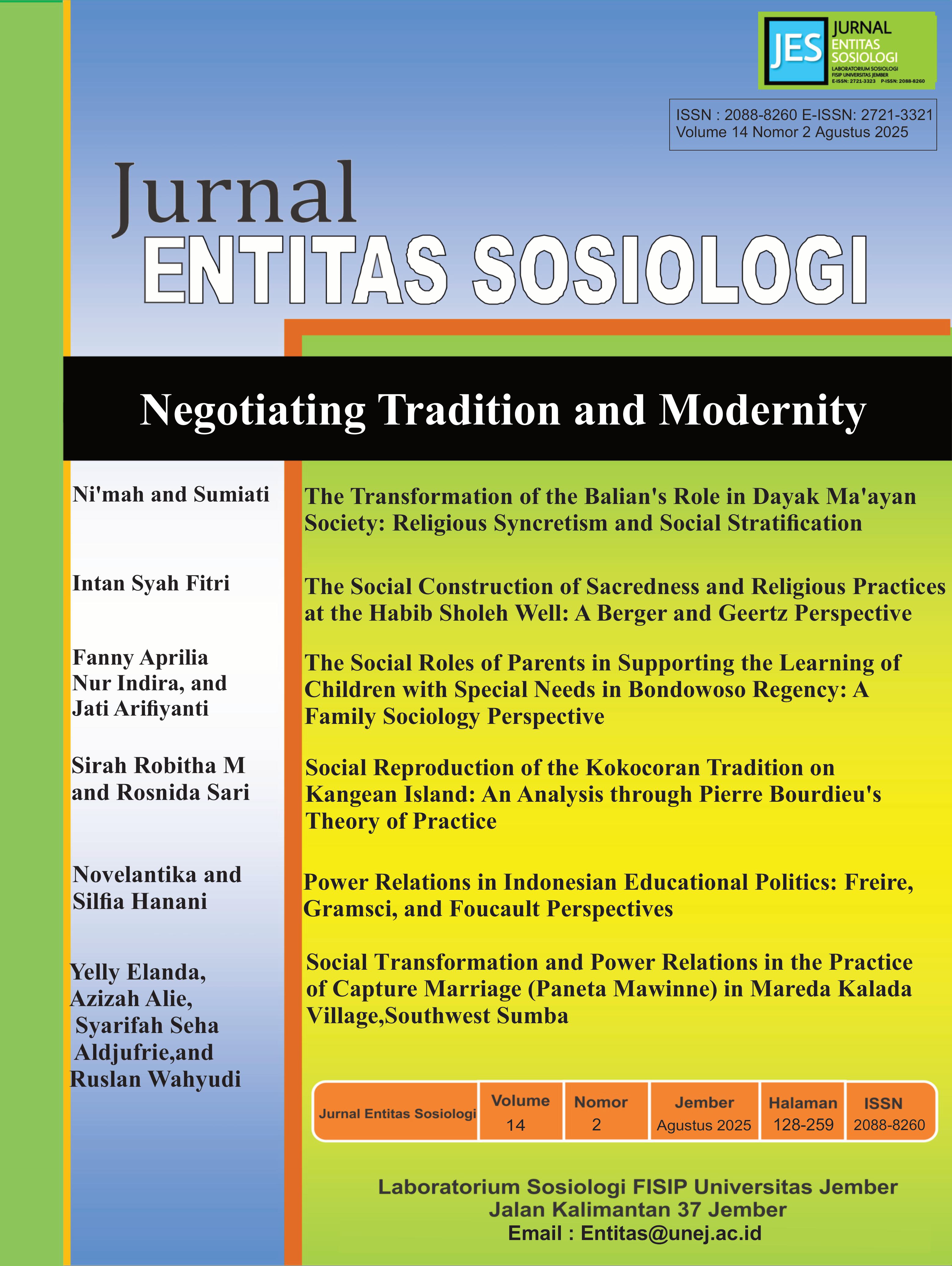 Vol. 14 No. 1 (2025)The Journal of Entitas Sosiologi (JES) provides space for the dissemination of ideas within the scope of sociology studies. This journal also provides space for various perspectives in sociology, especially for developing ideas that can encourage the transformation of society towards an advanced and sustainable society. In this edition, the Journal of Entitas Sosiologi (JES) presents the theme of Social Dynamics and Community Transformation. The first article, Pasaran Island Bandar Lampung District after Self-Funded Reclamation: Trajectory, Livelihood Structure, and Ethnicity. The second article focuses on The Local Institutional Dynamics and The Capability of Food Barns Group in The Village of Tirta Mulya, Air Manjunto Subdistrict, Mukomuko Regency. The third article The Dilemma of the Sandur Manduro Art Community in Jombang Regency: Between Innovation and Tradition Preservation; the fourth article on From Street to Screen: Online Buskers in Digital Society within Anthony Giddens' Structuration Perspective; the fifth article on The Role of Digital Philanthropy at Jogokariyan Mosque in Realizing Religious Moderation; and the last article is about Toxic Parenting In Economically Disadvantaged Families In Wringinputih Village, Muncar District, these articles discuss Social Dynamics and Community Transformation. Jurnal Entitas Sosiologi (JES) accepts articles in the form of research results, studies, and book reviews that support the dissemination of ideas and enrichment of sociology-based science.